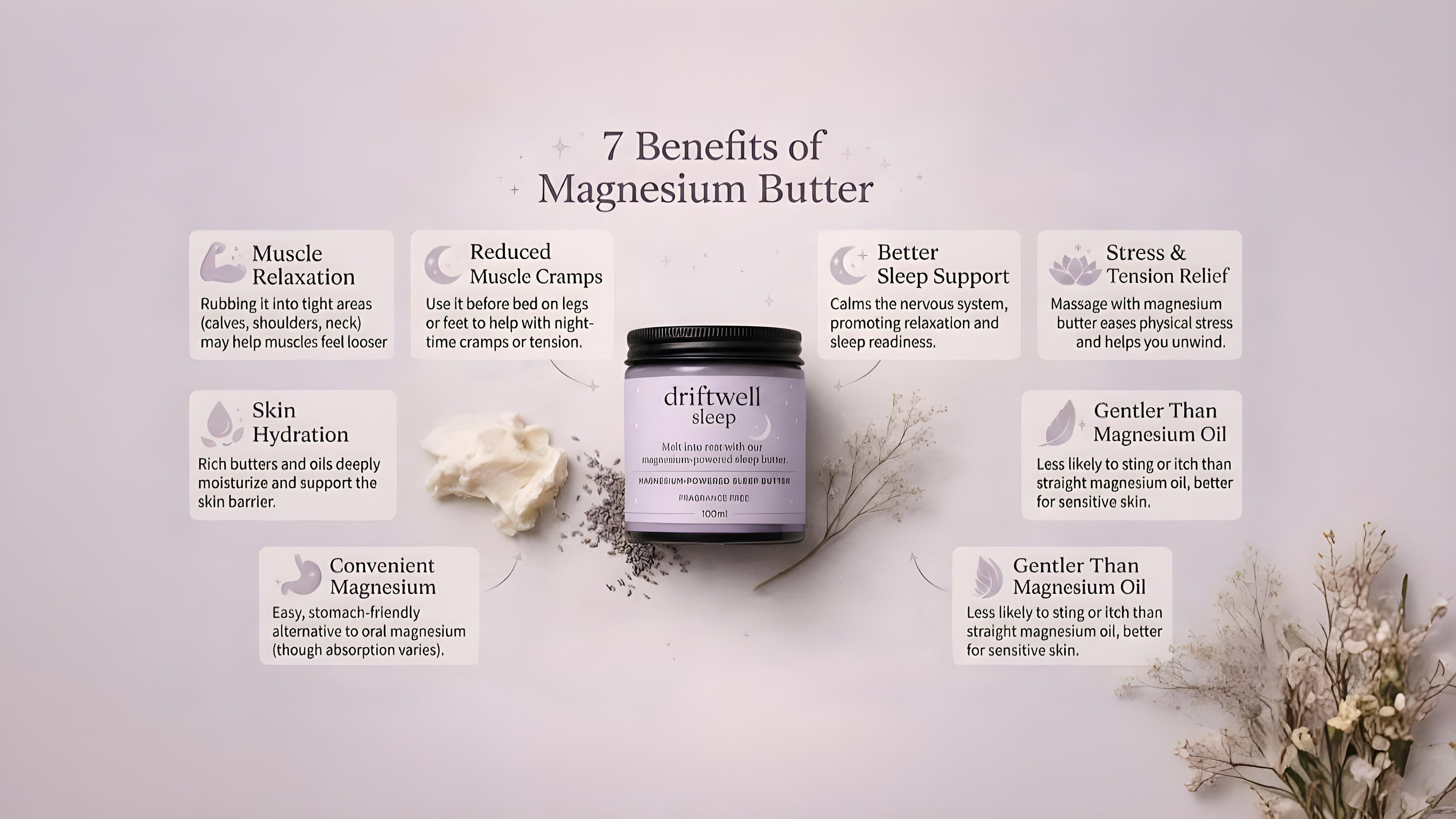 Experience the calming embrace of our magnesium butter, designed to enhance your sleep ritual during the colder months.